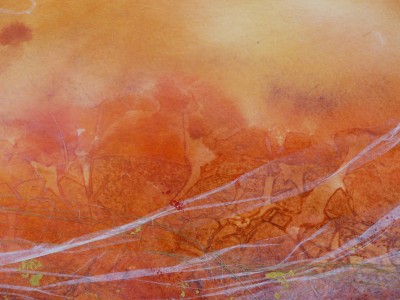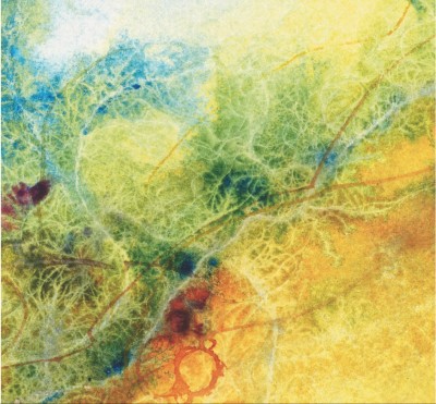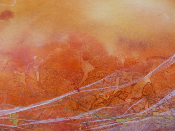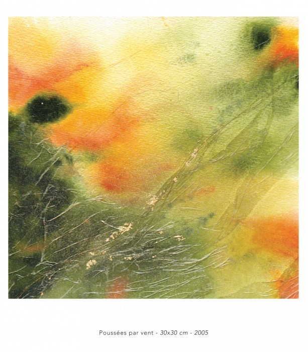 Quand l’aquarelle est totalement sèche, je peux (ou non selon le résultat désiré) y coller du papier de soie, des fibres textiles ou végétales, de la feuille d ‘or, des pigments purs, la "raccomoder" en cousant le papier…